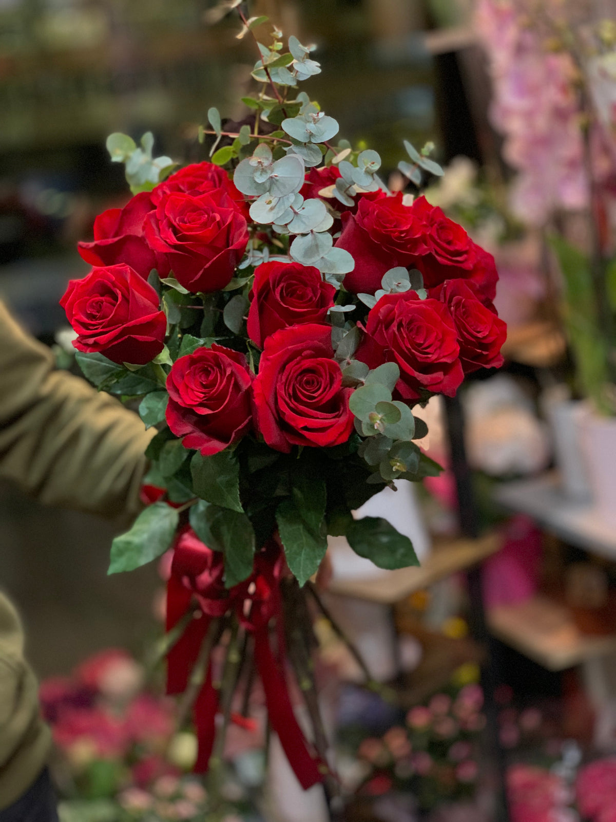 Buchet 15 Trandafiri Rosii de grădină, Eucaliptus