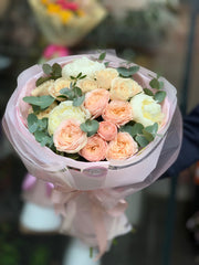 Îmbrățișează eleganța rafinată și delicatețea cu acest aranjament floral deosebit în nuanțe pastel, creat special pentru momentele în care vrei să transmiți emoții pure și sentimente profunde.