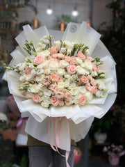 Elegant verpackt in hochwertigem, transluzentem weißem Papier mit dekorativen puderrosafarbenen Bändern ist dieser Strauß die ideale Wahl für Jubiläen, Liebeserklärungen, besondere Geschenke oder um Eleganz und Frische in Ihr Zuhause zu bringen.