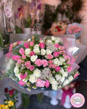 Buchet rafinat cu trandafiri albi, roz și lalele, decorat cu accente delicate.