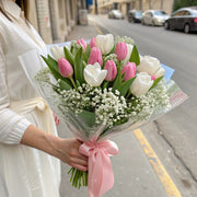 Un buchet delicat de primăvară cu 6 lalele roz și 5 albe, completate de gypsophila aerisită. O alegere perfectă pentru un cadou sau o ocazie specială. Decorat în hârtie transparentă și legat cu o panglică roz.