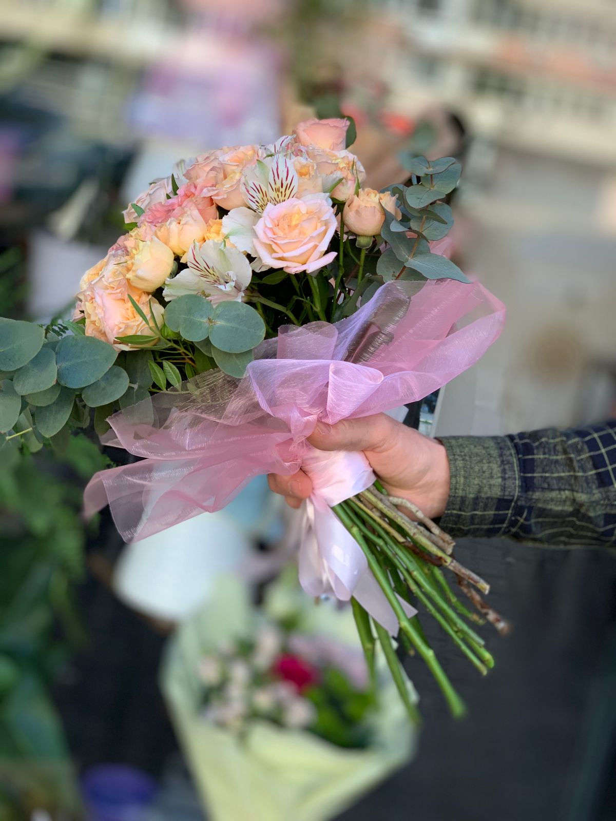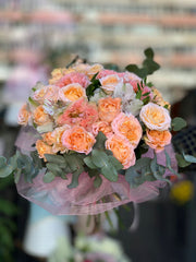 Buchet delicat cu trandafiri tros în nuanțe de roz și piersică, completat cu alstroemeria albă și eucalipt.