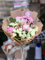 Свежая и нежная композиция, привносящая свежесть весны через гармоничное сочетание розовых пионов с белыми розами и красочными альстромериями.
