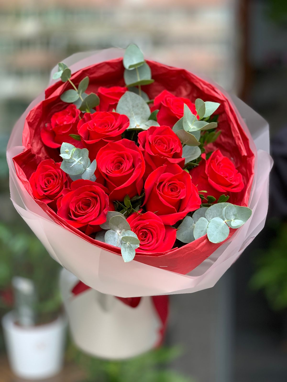Buchet Trandafiri Rosii cu Eucalipt - 11