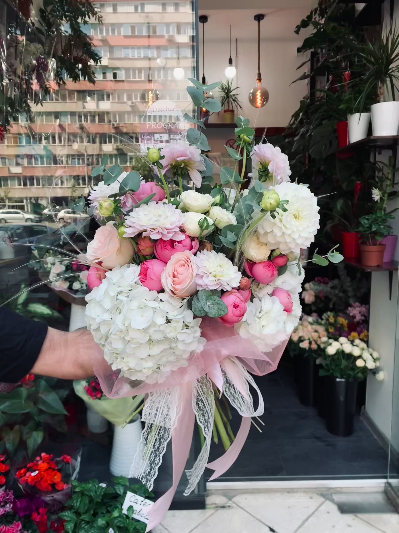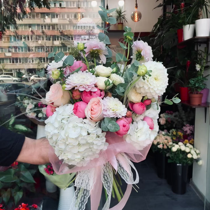 Buchet spectaculos și luxos care combină perfect hortensiile albe voluminoase. Aranjamentul impresionant în ambalaj roz cu dantelă este perfect pentru cele mai speciale ocazii și creează o atmosferă de eleganță deosebită.